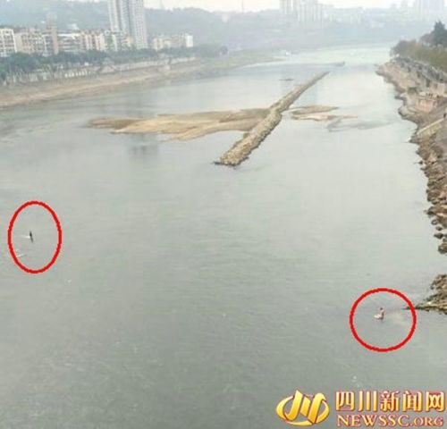 冬季的沱江處于枯水期,江水被中間的石塊分隔成兩條,中間石塊形成孤島。小伙子入水的地方是右邊水流湍急的一側,只見他入水后不久,被沖了百米遠外冒出了水面,竟奇跡般站在了水中央的淺水處。