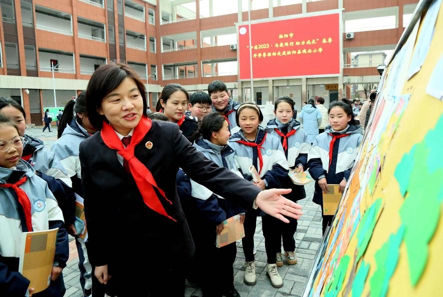 開學伊始,河南省洛陽市開展&ldquo;護苗2023&middot;與愛同行 助力成長&rdquo;專項行動。圖為2月15日,洛陽市澗西區人民檢察院檢察官在瑞云小學給同學們講解遠離 ... [更多詳細]