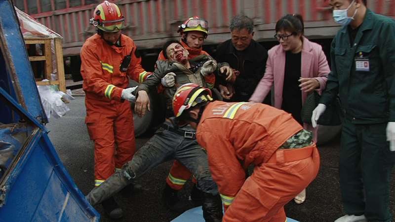 圖2為消防隊員利用救援器械對被困司機展開救援。