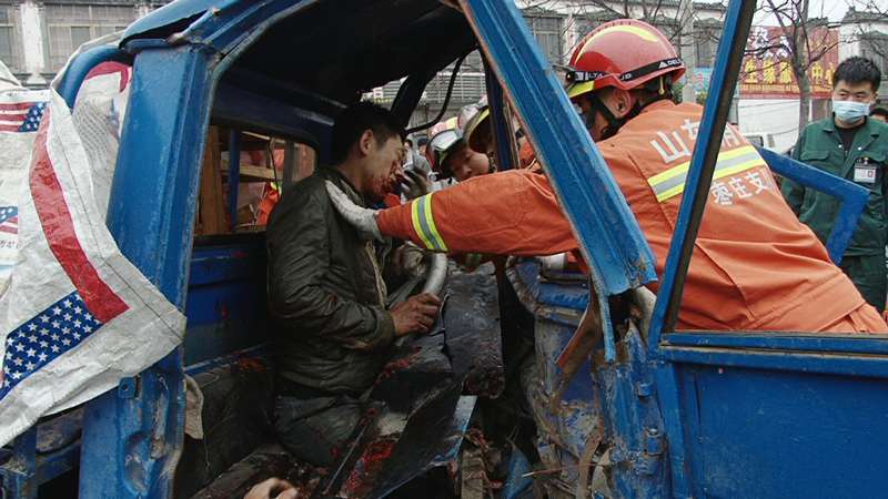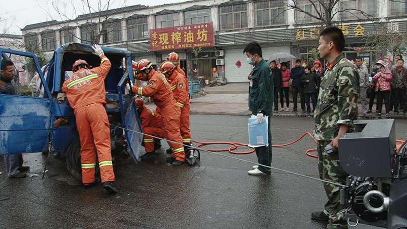 日前,山東省棗莊市滕州大塢鎮境內發生一起三輪車與灑水車相撞事故,導致三輪車駕駛室嚴重變形,駕駛員被困車內。接到報警后,滕州消防大隊善國中隊消防隊員迅速趕到現場進行救援。救援人員使用消防車的牽引繩對與駕駛員身體黏貼在一起的三輪車車頭進行拉伸,然后對車頭進行破拆,經過全體官兵20多分鐘救援,被困駕駛員被成功解救出來并送醫院救治。
