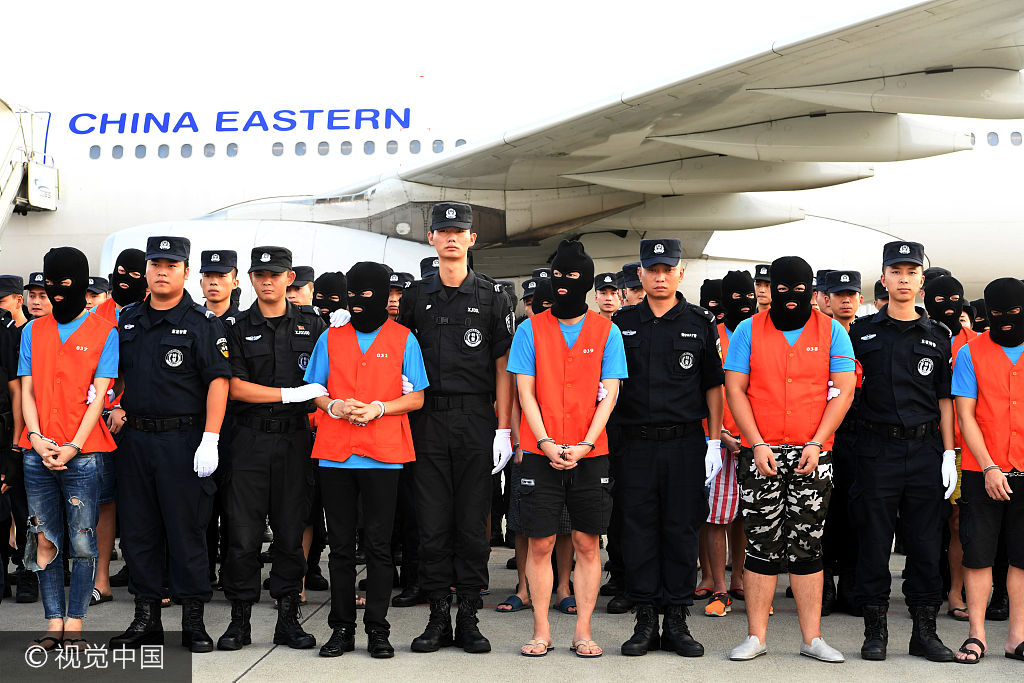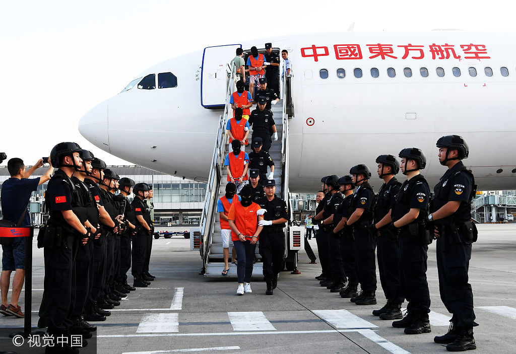 2017年8月3日18時40分,一架印度尼西亞雅加達的航班抵達成都雙流國際機場。58名嫌疑人被四川警方從印度尼西亞押解回國。6輛特警車輛將這批嫌疑人即刻轉送案源地四川眉山市進一步調查處理。