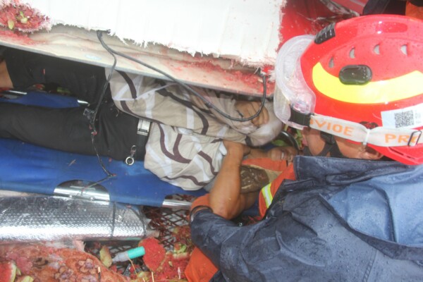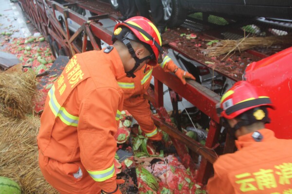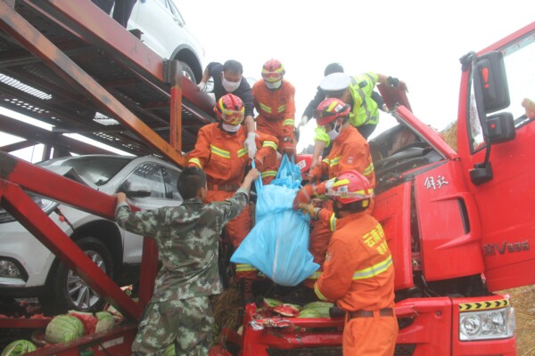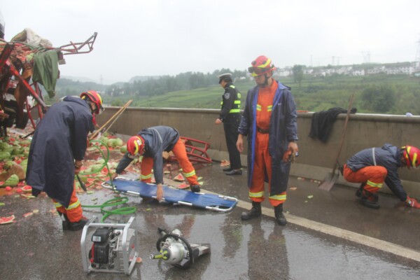 現場指揮員員根據事故現場情況,立即下達作戰命令:救援一組配合現場交警實施警戒,防止次生災害發生;救援二組人員攜帶液壓剪切鉗、頂桿、擔架等破拆工具到達現場實施救援;救援三組由1名戰士對被困人員進行交談,穩定其情緒。隨著指揮員命令的下達,各小組迅速展開工作。這時,天空下起了大雨,無疑給救援工作增加了難度。但這并不影響救援工作的展開,救援二組人員,首先發現一名被困人員被西瓜掩埋,立即進行施救。遺憾的是,經現場醫護人員確認,被掩埋的被困人員,已無生命特征。然而傳來被困人員呼救聲,尋聲發現被困人員被夾住了。指揮員斟酌后,先對呼救被困人員進行施救。救援人員立即利用破拆工具對被困人員進行救援,在施救過程中不斷安撫被困人員情緒,系配合救援工作。7時40分,成功把被困人員救出,并交由現場醫護人員實施救治。這時,救援人員對掩埋在西瓜堆里的被困人員進行施救,卻發現該被困人員肚子破裂。7時50分,殯儀館車到達現場,經殯儀館工作人員與消防官兵聯合作戰,終于把被困人員救出。指揮員下令收整器材歸隊,并轉交手中的清理工作,至此,整個救援行動圓滿結束。