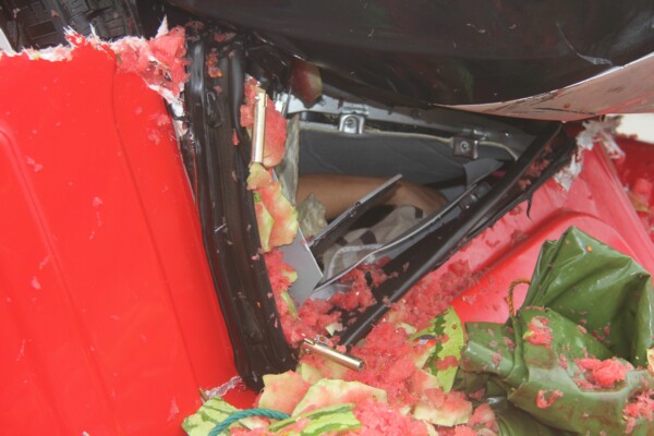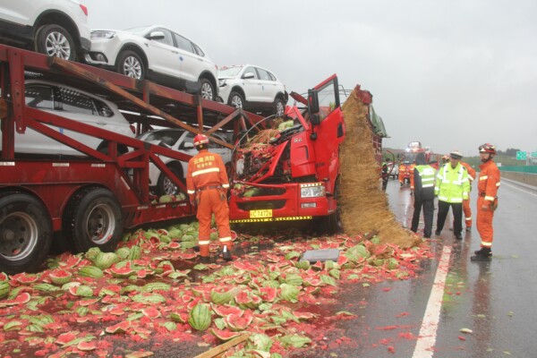 7時15分,救援官兵到達事故現場后,立即對現場情況進行了偵察:發現事故車輛為分別1輛拉西瓜和轎車的掛車,追尾車輛車頭嚴重變形。造成1名被困人員被掩埋在西瓜堆里,另1名被困人員夾在掛車車尾位置,無法將被困人員救出。