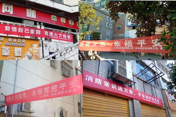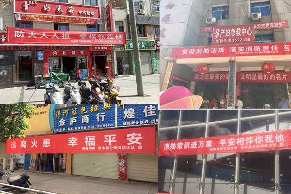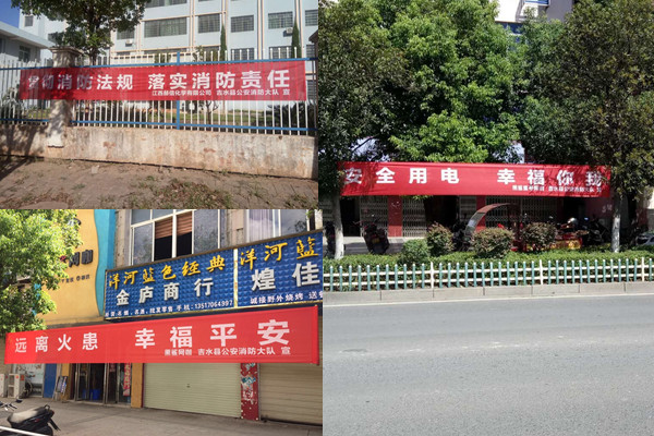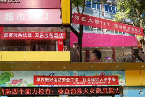 吉水縣消防大隊聯合各重點單位制作內容為“貫徹消防法規,落實消防責任”、“防火裝心間,一生保平安”、“愛惜自己家園,驅逐火災隱患”、“ 人人把好防火關,有備無患保平安”、“常識進萬家,平安相伴你我他”等消防宣傳條幅共計百余條,利用地理優勢,懸掛在各重點單位主樓外,吸引市民們對消防安全的關注,特別是火災預防的普遍關注,同時,吉安支隊吉水大隊立足實際不斷創新,在縣城繁華路段文化中路、文峰中大道、105國道沿線,利用消防宣傳車喇叭播放消防宣傳標語開展沿街宣傳,廣泛傳播消防安全知識。