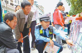 日前,貴州省丹寨縣交警大隊利用趕集日,在城區國土路集中開展交通安全宣傳。圖為交警向群眾講解典型交通事故案例。