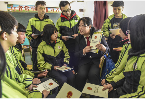 資料圖:深州市人民法院法官在長江中學向學生們解讀未成年人保護法。
