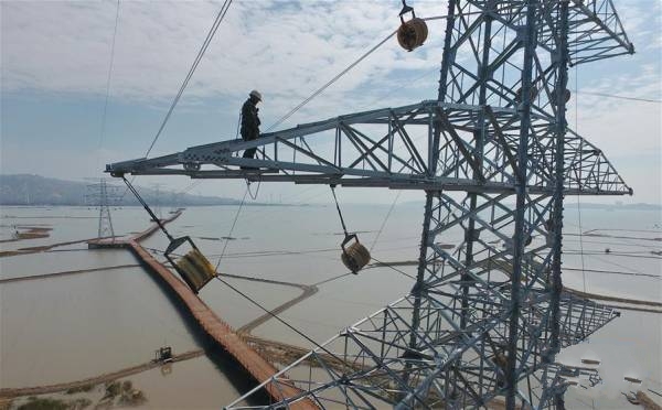 10月25日,施工人員在莆田平海灣上的風(fēng)電220千伏送出工程施工現(xiàn)場(無人機(jī)拍攝)。  當(dāng)日,福建省重點(diǎn)工程&mdash;&mdash;莆田埭頭風(fēng)電220千伏送出工程第一根導(dǎo) ... [更多詳細(xì)]