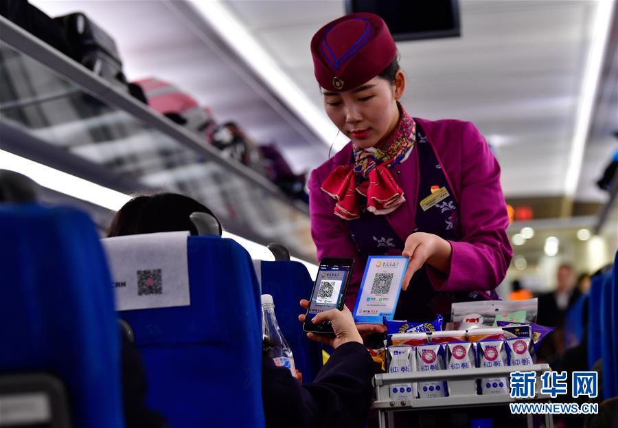 2月9日,在重慶客運(yùn)段G8516次列車上,一名旅客在使用手機(jī)掃碼支付購買飲用水。 2018年春運(yùn)于12日順利結(jié)束。來自交通運(yùn)輸部的初步統(tǒng)計顯示,春運(yùn)40天,全國旅客發(fā)送量約29.7億人次,與去年基本持平。交通運(yùn)輸部有關(guān)負(fù)責(zé)人表示,春運(yùn)期間,全國運(yùn)輸能力總體適應(yīng),群眾“一票難求”問題進(jìn)一步緩解,煤炭、天然氣、肉禽、蔬菜等重點(diǎn)物資運(yùn)輸總體有序。鐵路在正常運(yùn)力基礎(chǔ)上,每天增加直通臨客287對,夜間臨時動車組88.5對;公路投入客車84萬輛、2100余萬客位;水路投入船舶2萬余艘、100余萬客位;民航安排加班計劃5166班,夜間航班1萬余個。新華社記者 劉潺攝