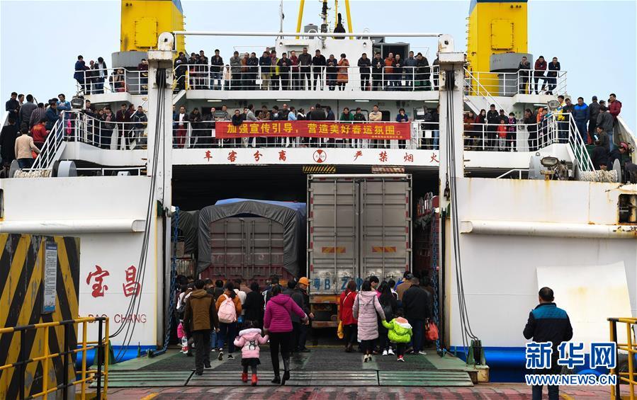 2月1日,在?谛潞8鄞a頭,旅客走上客滾船準(zhǔn)備出發(fā)。 2018年春運(yùn)于12日順利結(jié)束。來自交通運(yùn)輸部的初步統(tǒng)計顯示,春運(yùn)40天,全國旅客發(fā)送量約29.7億人次,與去年基本持平。交通運(yùn)輸部有關(guān)負(fù)責(zé)人表示,春運(yùn)期間,全國運(yùn)輸能力總體適應(yīng),群眾“一票難求”問題進(jìn)一步緩解,煤炭、天然氣、肉禽、蔬菜等重點(diǎn)物資運(yùn)輸總體有序。鐵路在正常運(yùn)力基礎(chǔ)上,每天增加直通臨客287對,夜間臨時動車組88.5對;公路投入客車84萬輛、2100余萬客位;水路投入船舶2萬余艘、100余萬客位;民航安排加班計劃5166班,夜間航班1萬余個。新華社記者 楊冠宇攝