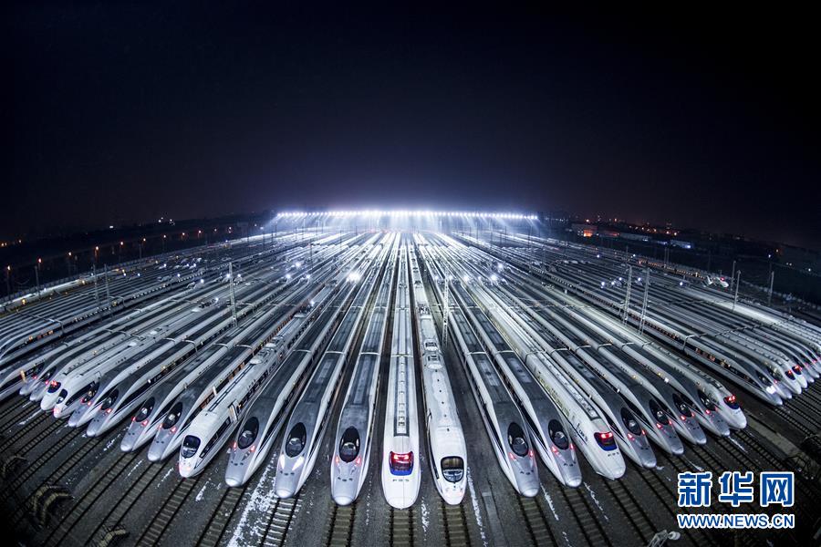 2月1日凌晨,動車組?吭谖錆h動車段的存車線上,準(zhǔn)備進(jìn)行檢修和保溫作業(yè)。 2018年春運(yùn)于12日順利結(jié)束。來自交通運(yùn)輸部的初步統(tǒng)計顯示,春運(yùn)40天,全國旅客發(fā)送量約29.7億人次,與去年基本持平。交通運(yùn)輸部有關(guān)負(fù)責(zé)人表示,春運(yùn)期間,全國運(yùn)輸能力總體適應(yīng),群眾“一票難求”問題進(jìn)一步緩解,煤炭、天然氣、肉禽、蔬菜等重點(diǎn)物資運(yùn)輸總體有序。鐵路在正常運(yùn)力基礎(chǔ)上,每天增加直通臨客287對,夜間臨時動車組88.5對;公路投入客車84萬輛、2100余萬客位;水路投入船舶2萬余艘、100余萬客位;民航安排加班計劃5166班,夜間航班1萬余個。新華社記者 肖藝九攝