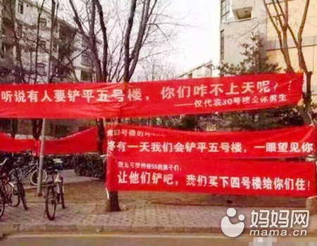 還有的較上勁啦!“終有一天我們會(huì)鏟平五號(hào)樓,一眼望見你。”“聽說有人要鏟平五號(hào)樓,你們咋不上天呢?僅代表30號(hào)樓全體男生。”“讓他們鏟吧,我們買下四號(hào)樓給你們住!