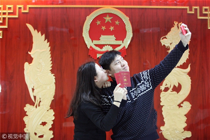 2019年2月14日,由于當(dāng)日是情人節(jié)。在江蘇省淮安市洪澤區(qū)民政局婚姻登記處,許多情侶選擇這一天辦理結(jié)婚登記手續(xù),讓這個(gè)浪漫的節(jié)日見證甜蜜的愛情。圖為一對新 ... [更多詳細(xì)]