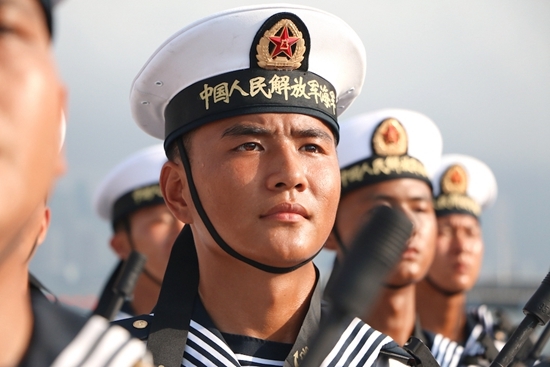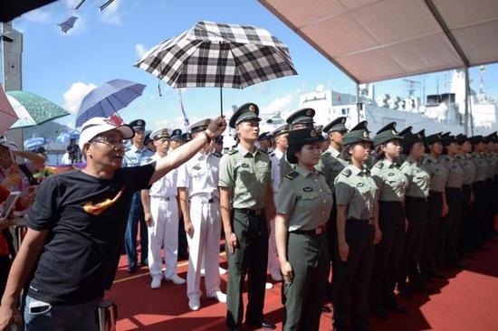 香港市民自發歡送遼寧艦   有市民對解放軍在烈日下暴曬感到&ldquo;心痛&rdquo;,為解放軍撐傘。(圖片來源:明報)    中國首艘航空母艦&ldquo;遼寧號& ... [更多詳細]