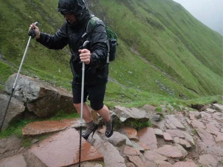 本·尼維斯山是英國最高山峰,海拔1345米,雖然也是很高的山,但是并不算是世界頂級,就算爬上去了也沒有太大的榮譽。不過,若是腳下踩著近13厘米的高跟鞋,那么結果就不一樣了。6月27日早晨8點,本在就到了山腳,同行的還有他的同學卡魯姆·麥克肯澤·阿倫(Callum MacKenzie Allen)。這位同學全程跟拍了這個5小時的艱難旅程,并幫忙把最終成果剪輯成了2分鐘長的一個短視頻,以用于申請獎學金。當時,他們剛爬到半山腰,本一只鞋的鞋帶就崩斷了,之后他全程都是靠膠帶把鞋帶粘起來的。同時,天公不作美,當天一直下雨,而且山上有時速四五十英里的強風(時速約64.3千米到80.5千米)。最終,他們爬了900米后不得不返回山下。回程路上本穿的是登山鞋。本表示:“我從來沒有爬過山,更別說穿高跟鞋爬山了。多數知道這事的人都對我非常支持,但也有不少人覺得我應該考慮下健康和安全問題。不過,我自己在倫敦出去瘋玩時,可比穿高跟鞋爬山受傷的次數多。起碼爬山時我還帶著創可貼。”