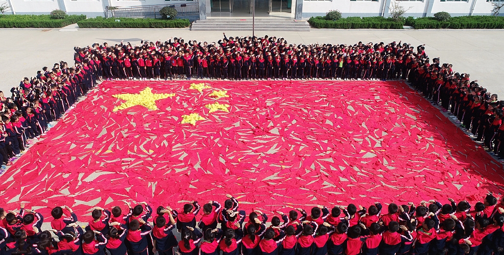 2018年9月28日,山東臨沂,沂南縣張哨中心小學(xué)師生用1500條紅領(lǐng)巾和150頂小黃帽,按照國(guó)旗的比例,拼成15米長(zhǎng)、10米寬的“巨幅國(guó)旗” ... [更多詳細(xì)]