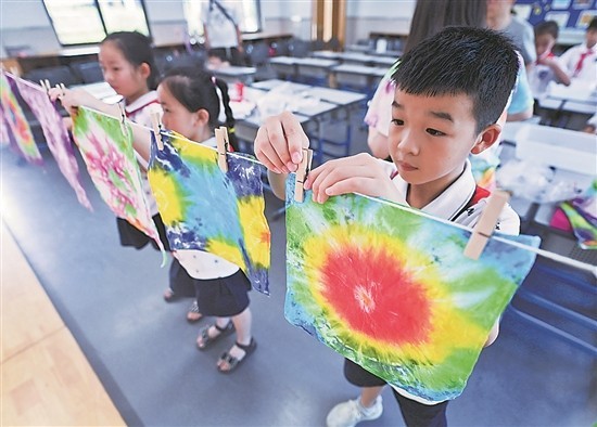 8月10日,湖州市吳興實(shí)驗(yàn)小學(xué)的學(xué)生把做好的扎染作品掛在教室里。位于浙江省湖州市的吳興實(shí)驗(yàn)小學(xué)開啟了以傳統(tǒng)鄉(xiāng)土文化為落腳點(diǎn)的&ldquo;博學(xué)課堂&rdquo;, ... [更多詳細(xì)]