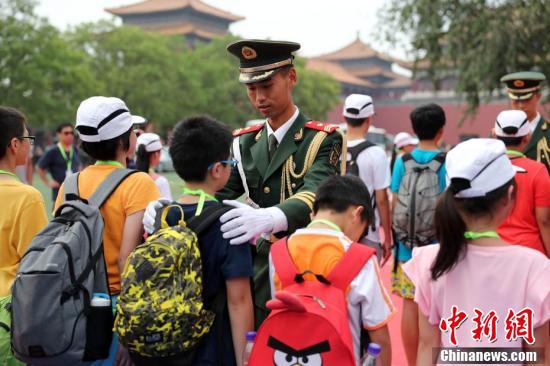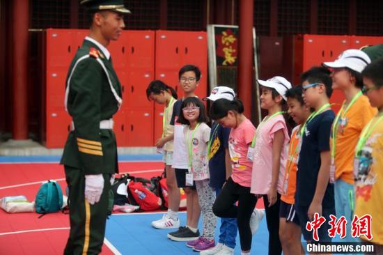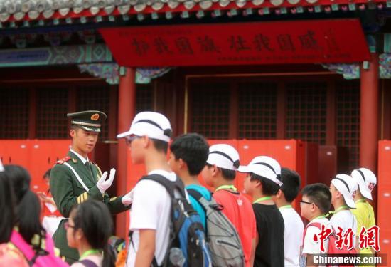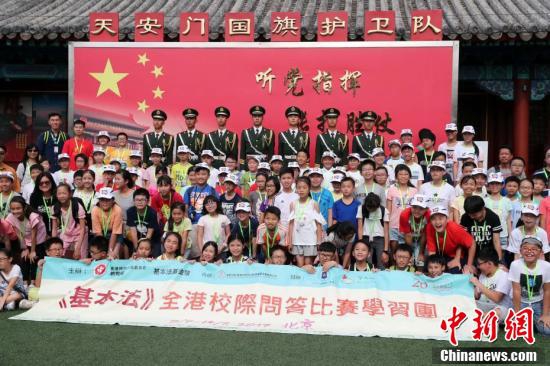 7月11日,香港小學生參觀武警北京總隊天安門國旗護衛隊。來自2017《基本法》香港校際問答比賽學習團的百名小學生,于7月9日至14日在北京參觀訪問。期間他們將聽取《基本法》講座、參觀外交部、航天城、清華大學、拜訪教育部。