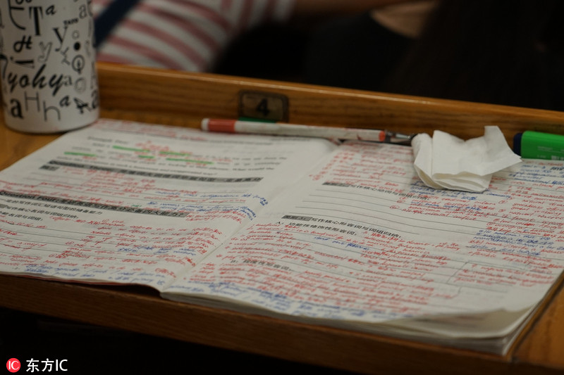 聽著政治課,一名同學(xué)寫滿紅字的英語(yǔ)講義卻擺在桌上。
