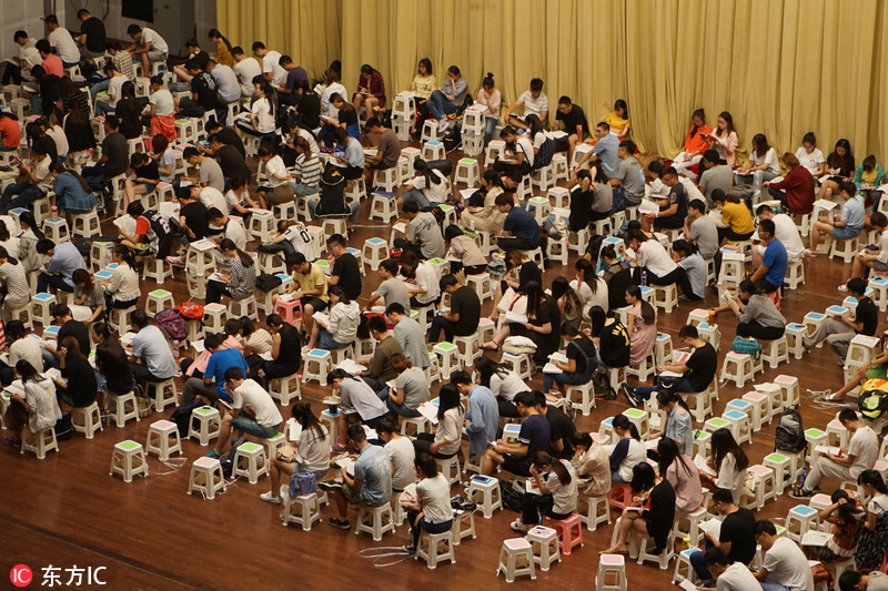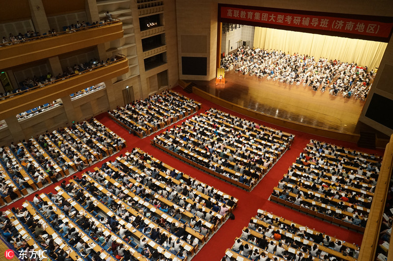2017年7月31日,山東濟(jì)南,漫漫考研路,考研族老師上課,場(chǎng)面十分壯觀,座位上座無虛席,沒有座位的同學(xué)坐在舞臺(tái)上臨時(shí)的座椅上課認(rèn)真記筆記。休息時(shí)間,同學(xué)們帶上耳機(jī)和眼罩或趴或靠著椅子休息睡覺補(bǔ)充精力。舞臺(tái)左側(cè)的老師被學(xué)生們包圍著。