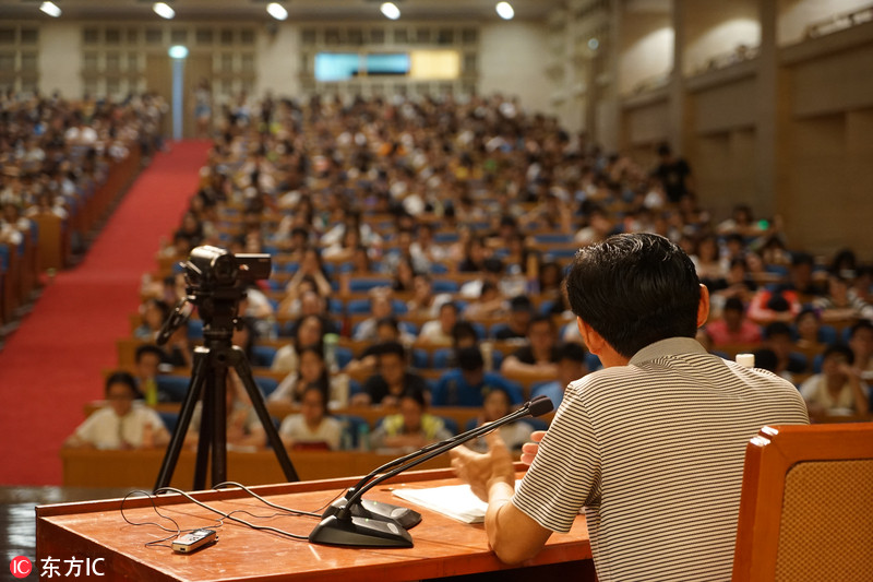 政治老師面對(duì)著全場(chǎng)3000多名學(xué)生上著課。