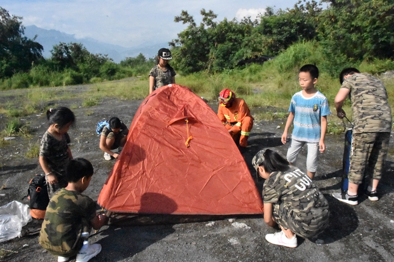 野營,貼近實際。為了提高大家的逃生能力,大隊還組織學員開展了戶外拓展訓練,30名孩子家庭首先攜帶裝備徒步前行3公里,前往指定地點集結,到達結合地點后,在消防官兵指導下,大家迅速搭建帳篷,雖然很多家庭都是第一次參加這樣的活動,搭建帳篷過程中也顯得極其生疏,有的錯系了扣子,有的忘記了支撐桿,但每個家庭仍然堅持完成任務。
