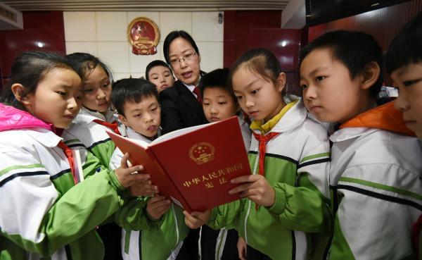 2017年11月30日,在河北省邯鄲市叢臺區人民法院,法官向叢臺小學的學生講解憲法知識。   加大全民普法力度,推動全社會尊法、學法、守法、用法,記者從國務院 ... [更多詳細]