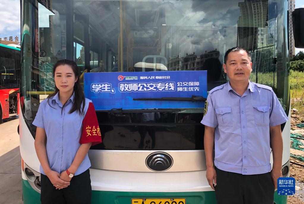 9月6日,武艷夢(左)和楊文剛在兩人負責的校園公交專線公交車前合影(受訪者供圖)。