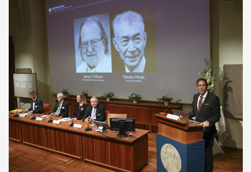 10月1日,在瑞典斯德哥爾摩卡羅琳醫(yī)學(xué)院舉行的新聞發(fā)布會(huì)現(xiàn)場(chǎng),大屏幕顯示美國(guó)科學(xué)家詹姆斯&middot;艾利森(左)和日本科學(xué)家本庶佑的照片。在美國(guó)得克薩斯大學(xué) ... [更多詳細(xì)]