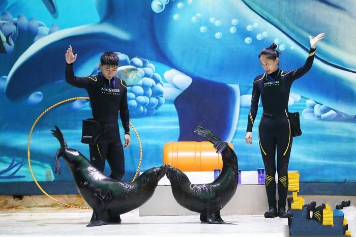 陳琳(右)和李蘇雨帶著海獅兄弟麥迪和卡特(左)登臺表演?ㄌ厥歉绺,今年四歲,非澳毛皮海獅;麥迪是弟弟,今年三歲,南美毛皮海獅。 泱波 攝這看似簡單的飼 ... [更多詳細]