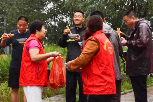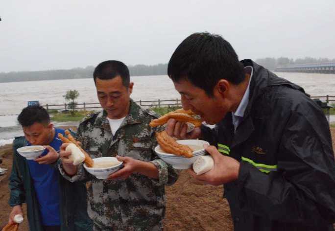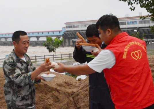 日前,山東省郯城縣馬頭鎮慈善愛心協會的志愿者,端來了熱氣騰騰的熱“糝”,讓連夜值守在沂河岸邊的應急隊員,除去“臺風”的寒氣。