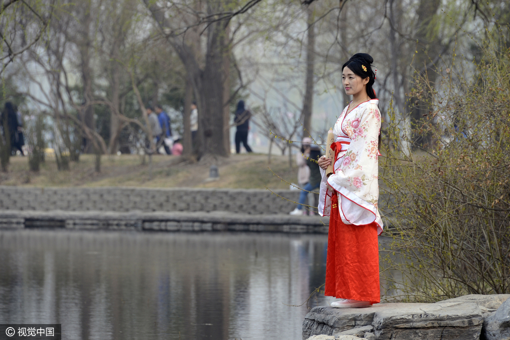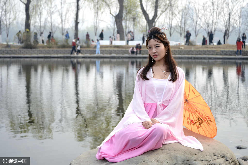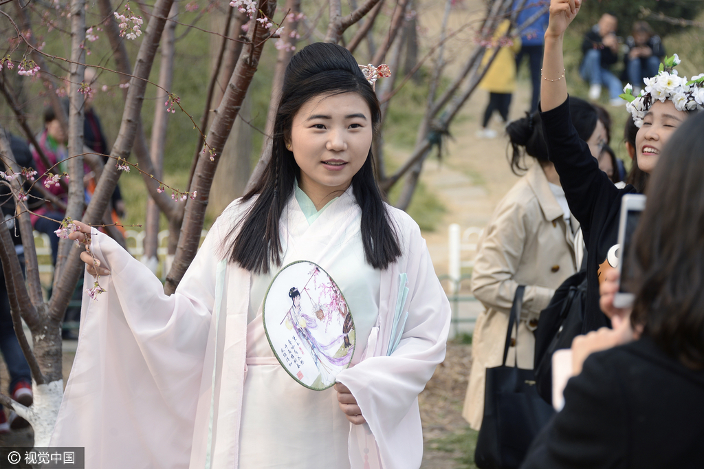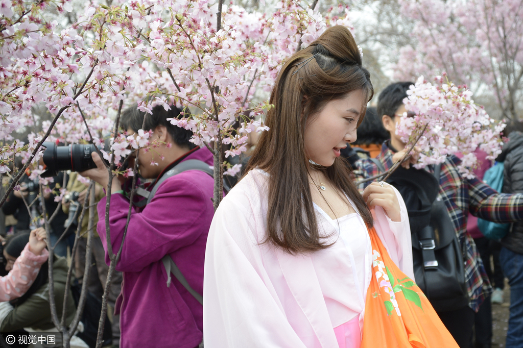 2017年3月19日,北京玉淵潭公園櫻花開放,吸引眾多游客前來踏青賞花,享受美好春光。不少美女精心打扮,身著古典漢服擺出各種唯美造型,在花海中盡情留影,吸引不少游人圍觀。