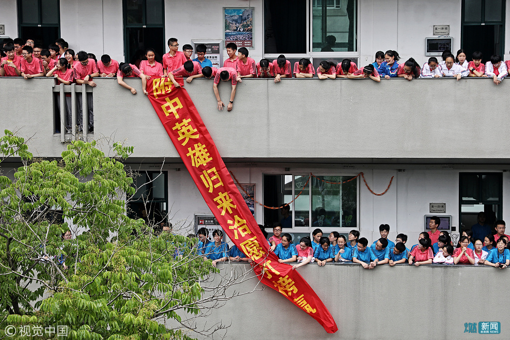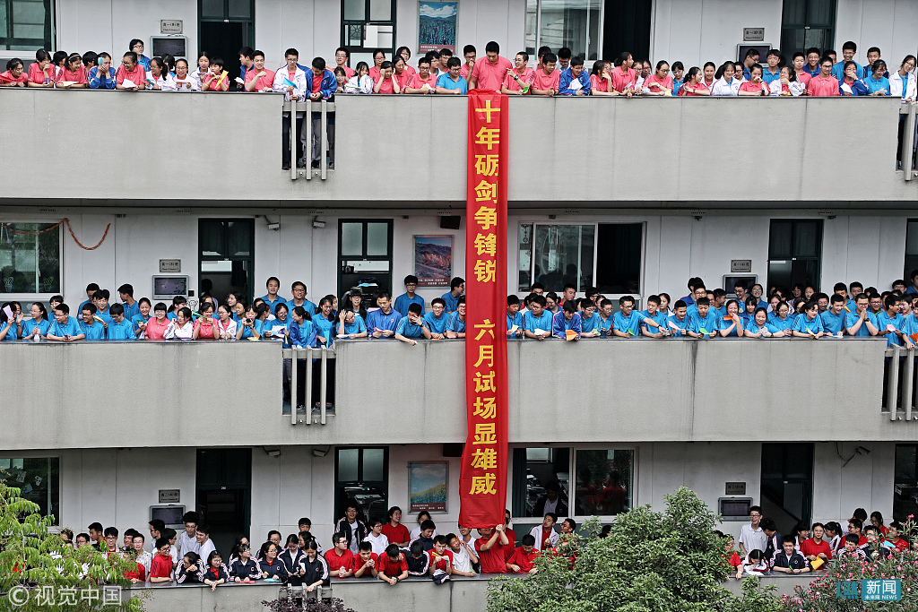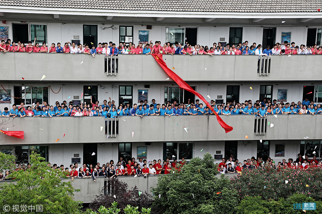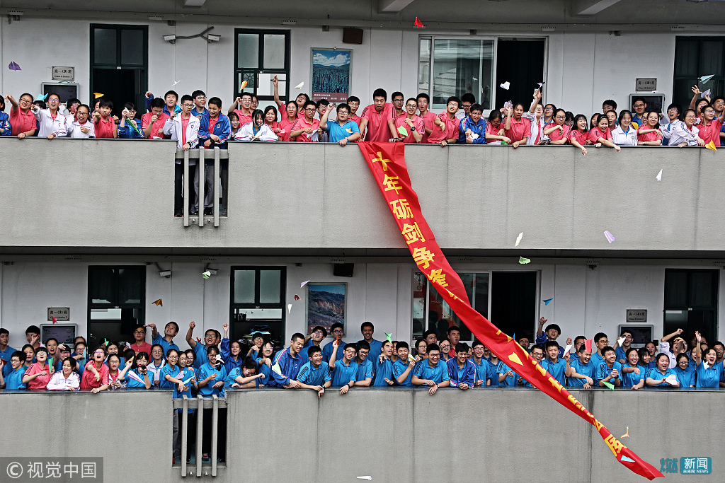 2018年6月5日,杭州,浙大附中高一高二的1000余名學生集體喊樓,放飛寫滿祝福語的五彩紙飛機,為即將高考的學長學姐鼓勁加油。