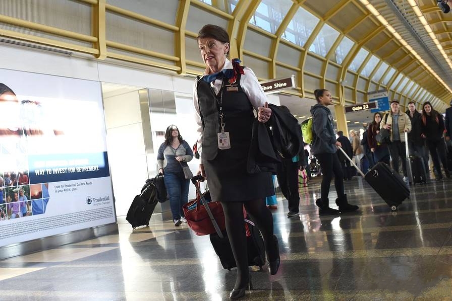 當地時間2017年12月19日,美國阿靈頓,美國航空公司在職時間最長的空姐、現年81歲的貝蒂&middot;納什準備下飛機。美國航空航班2160剛從波士頓飛抵華盛頓特區。貝 ... [更多詳細]