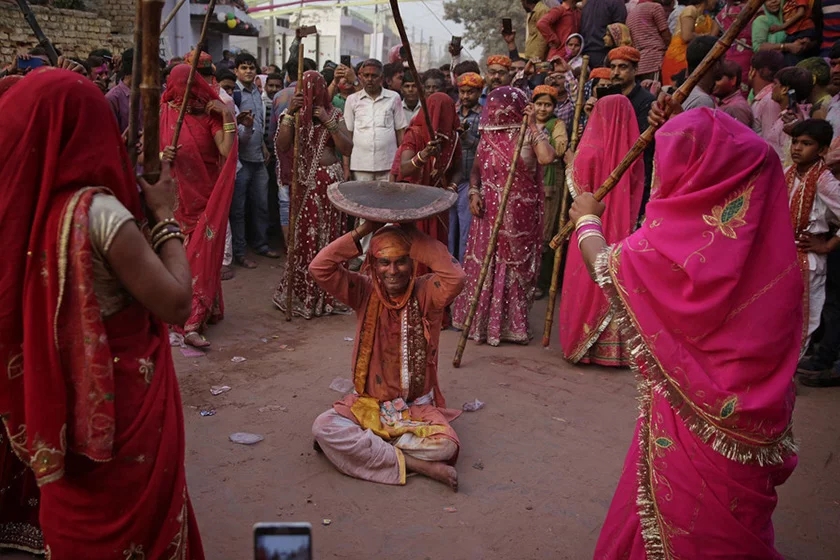 當地時間2018年2月24日,印度,當地民眾慶祝&ldquo;棒打男人節&rdquo;。圖/東方IC&ldquo;棒打男人節&rdquo;是胡里節的一部分,婦女身穿彩服頭裹紗巾,拿著竹竿打 ... [更多詳細]