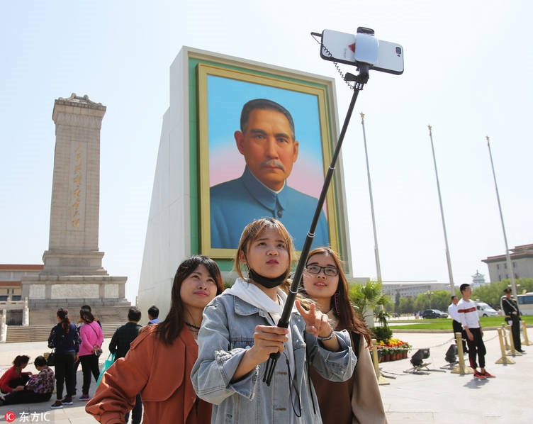 2018年4月27日,北京,游客紛紛在孫中山畫像前拍照留影。當天,孫中山巨幅畫像亮相天安門廣場,迎接即將到來的五一國際勞動節。