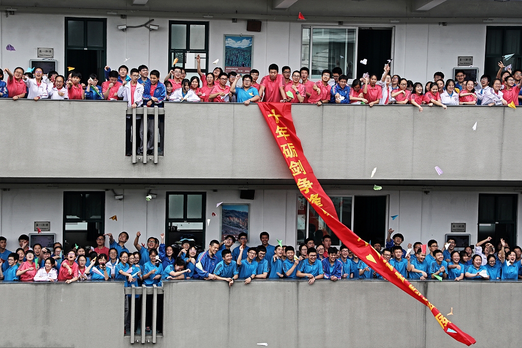 2018年6月5日,杭州,浙大附中高一高二的1000余名學生集體喊樓,放飛寫滿祝福語的五彩紙飛機,為即將高考的學長學姐鼓勁加油。
