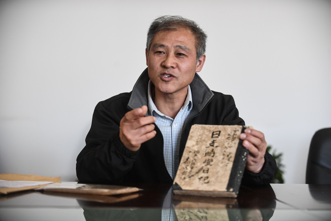 遼寧省本溪市收藏愛好者毛偉介紹他收藏的《日支時(shí)變?nèi)沼洝罚?017年12月9日攝)。新華社記者 潘昱龍 攝   南京大屠殺死難者國(guó)家公祭日前夕,中國(guó)近現(xiàn)代史史 ... [更多詳細(xì)]