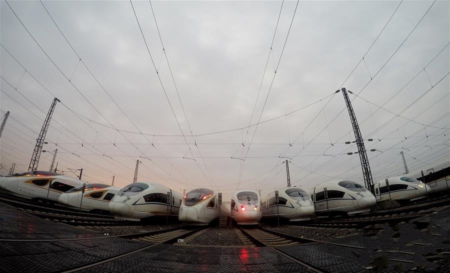 1月19日,一列完成檢修的高鐵列車駛?cè)牒鐦騽?dòng)車運(yùn)用所存車場(chǎng)。  春運(yùn)臨近,中國(guó)鐵路上海局集團(tuán)有限公司上海動(dòng)車段虹橋動(dòng)車運(yùn)用所經(jīng)過&ldquo;體檢&rdqu ... [更多詳細(xì)]
