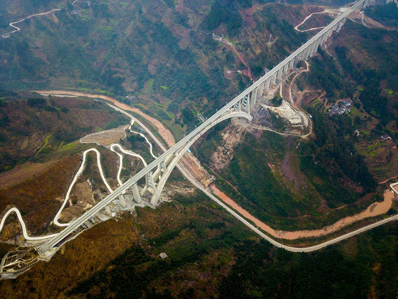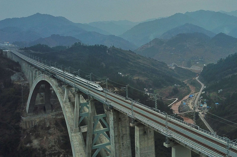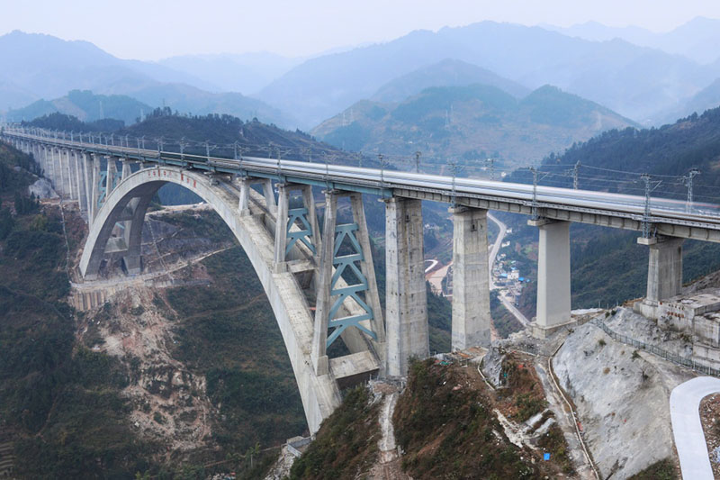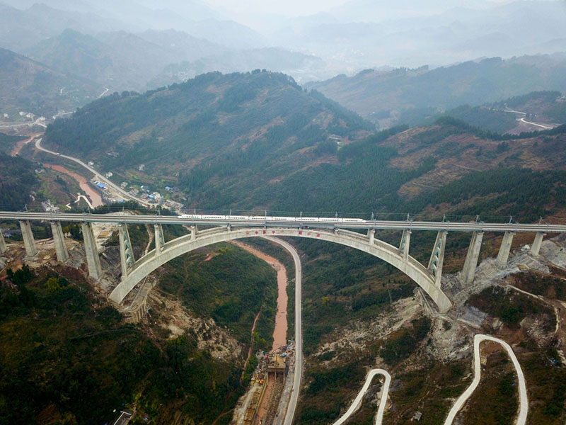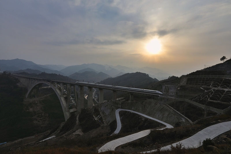 1月11日,一列動車組測試列車駛過夜郎河大橋。 經(jīng)過5年多艱苦建設(shè),世界首例“貫入式大體積嵌巖拱座基礎(chǔ)”大橋——夜郎河特大橋近日落成,與即將開通的渝貴鐵路一起進入檢測試運行階段。 夜郎河特大橋位于貴州省遵義市桐梓縣境內(nèi),是渝貴鐵路重點控制性工程之一。橋上線路為雙線,主橋采用X形“提籃式”拱橋設(shè)計,最大跨度370米,為國內(nèi)同類型橋梁跨度第一。