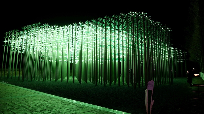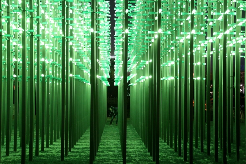 遠(yuǎn)處與城市樓宇光效遙相呼應(yīng),近處與湖水樹木相映成趣,游人置身其間則如入奇異幻境。