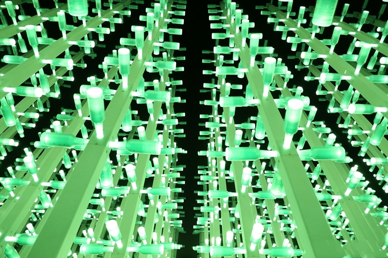 據(jù)悉,這片占地約兩百平米,由千余根 “啤酒樹”組成的“啤酒叢林”。伴著舒緩的背景音樂,由鋼立柱制作而成的“瓶酒樹”上30000余個塑料啤酒瓶受互動光作用。