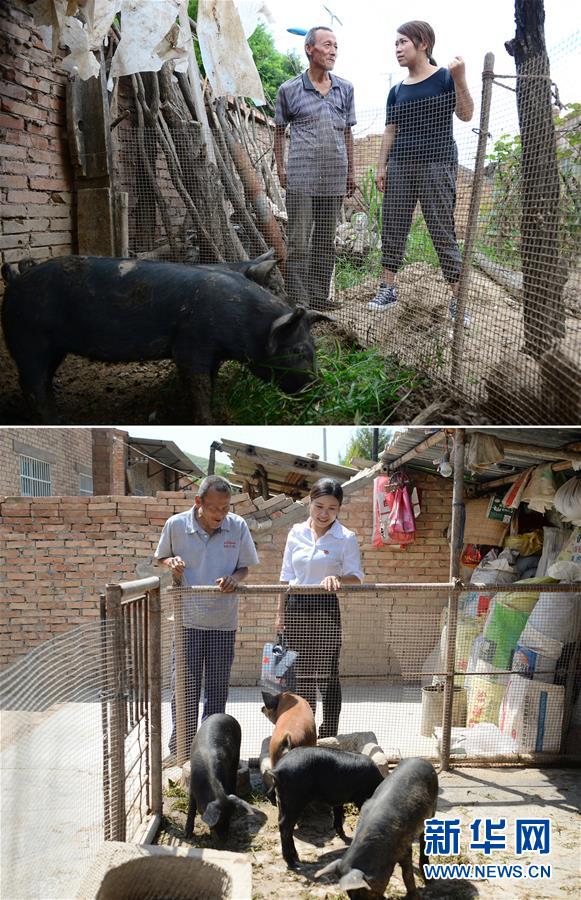 這是一張拼版照片,上圖為:張文妮(右)在榆樹村村民楊春芳家查看黑豬養(yǎng)殖情況(2016年7月28日攝);下圖為:張文妮(右)查看楊春芳家改造擴(kuò)大后的豬舍,黑豬數(shù)量已由2016年的兩頭變?yōu)楝F(xiàn)在的四頭(6月22日攝)。