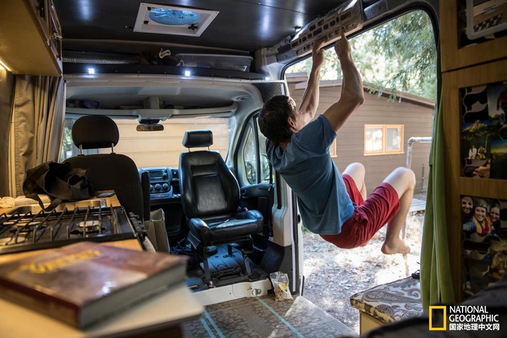 “這堪稱是無保護攀登領域的‘月球著陸’,” Tommy Caldwell說道。2015年,Tommy Caldwell與合作者Kevin Jorgeson一起登上了酋長巖難度最大的黎明墻線路,他們在攀登過程中使用了繩索和其它防護設備,主要是為了保護安全,不是為了協助攀登。圖為Honnold把自己懸吊在面包車頂部的一個指板上,通過這種方式增加自己的抓握力量。