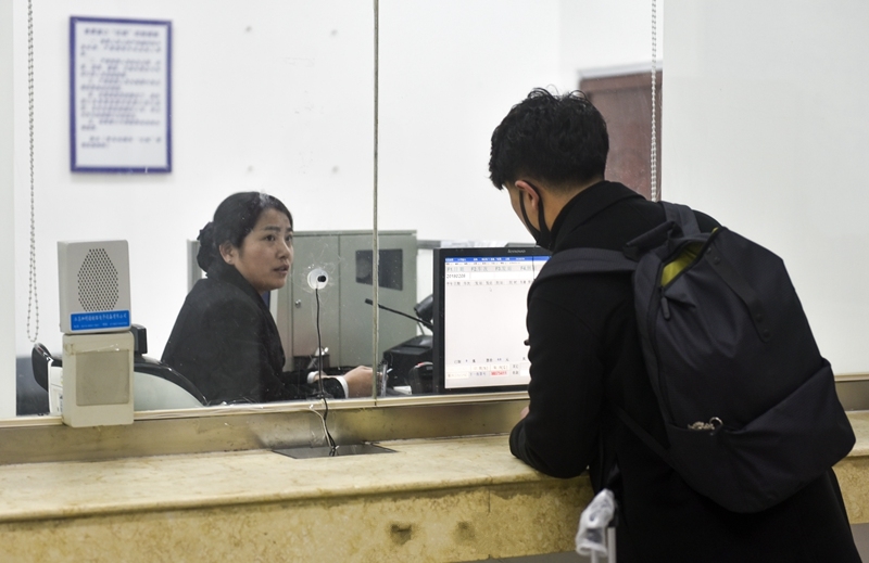 與丈夫的風吹雨淋不同,趙曉麗的工作就是守在窗口,為乘客提供最快捷的改簽、退票服務。