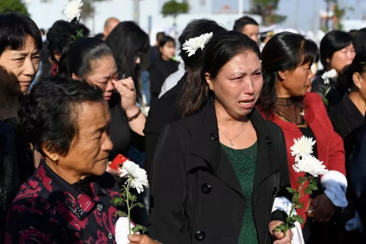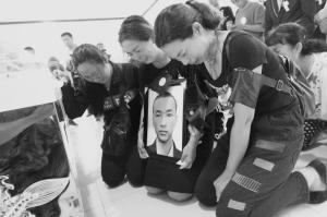獲救女子(中)在英雄靈前長跪不起。 手持英雄遺像的群眾。易水嗚咽,狼山含悲。從昨夜到記者發稿,易縣一直下著中雨。8月27日上午10點半,在荊軻塔下的殯儀館, ... [更多詳細]