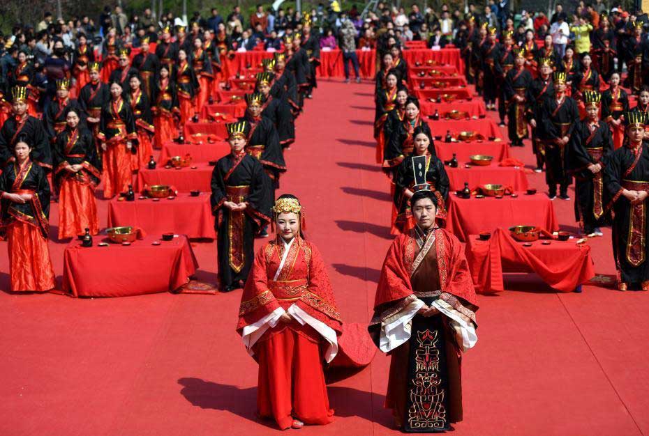 3月26日,漢服集體婚禮儀式中。當日,36對青年新人在安徽省合肥市三國遺址公園舉行漢式集體婚禮,新人們在贊禮官的帶領下,進行祈愿禮、拜謝禮、正席禮等漢式禮 ... [更多詳細]