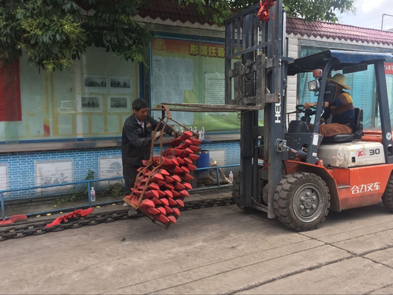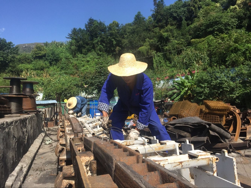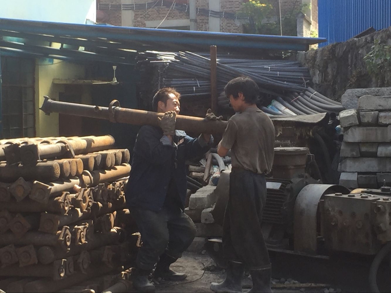 采煤1隊職工正協助生產服務公司人員對即將入井的順槽溜子的槽子進行加固