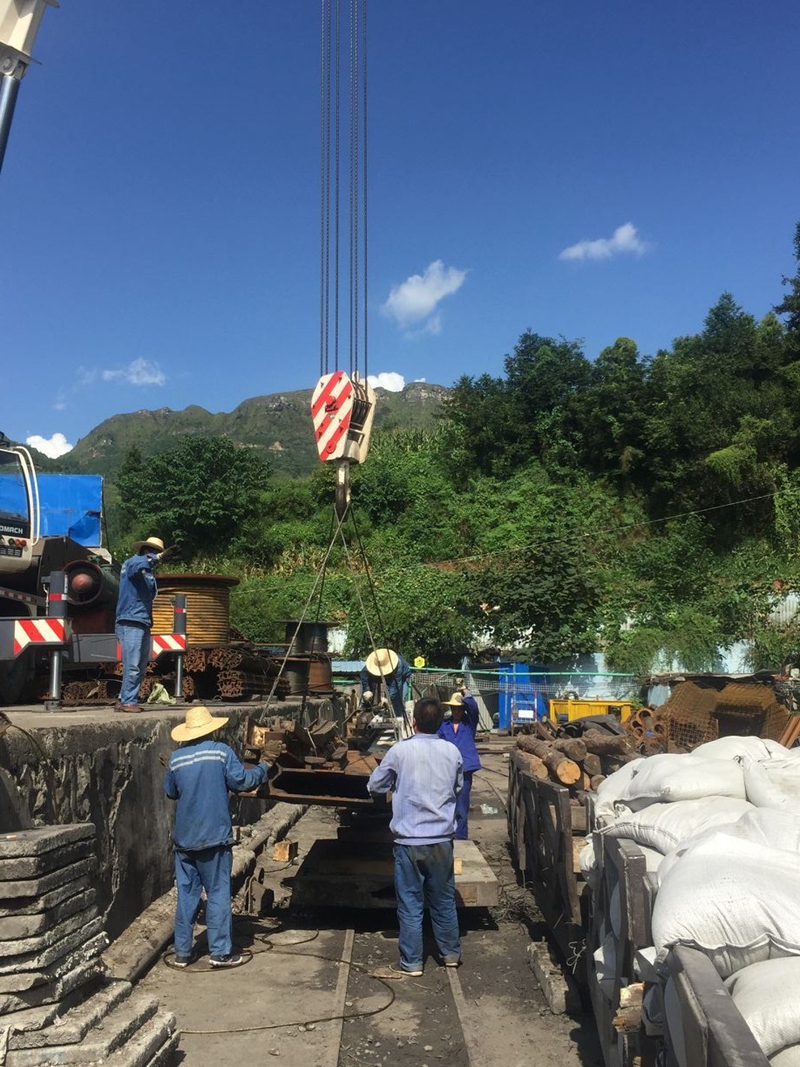 職工正協助生產服務公司人員吊裝131217里采面順槽溜子的槽子、鏈子與刮板