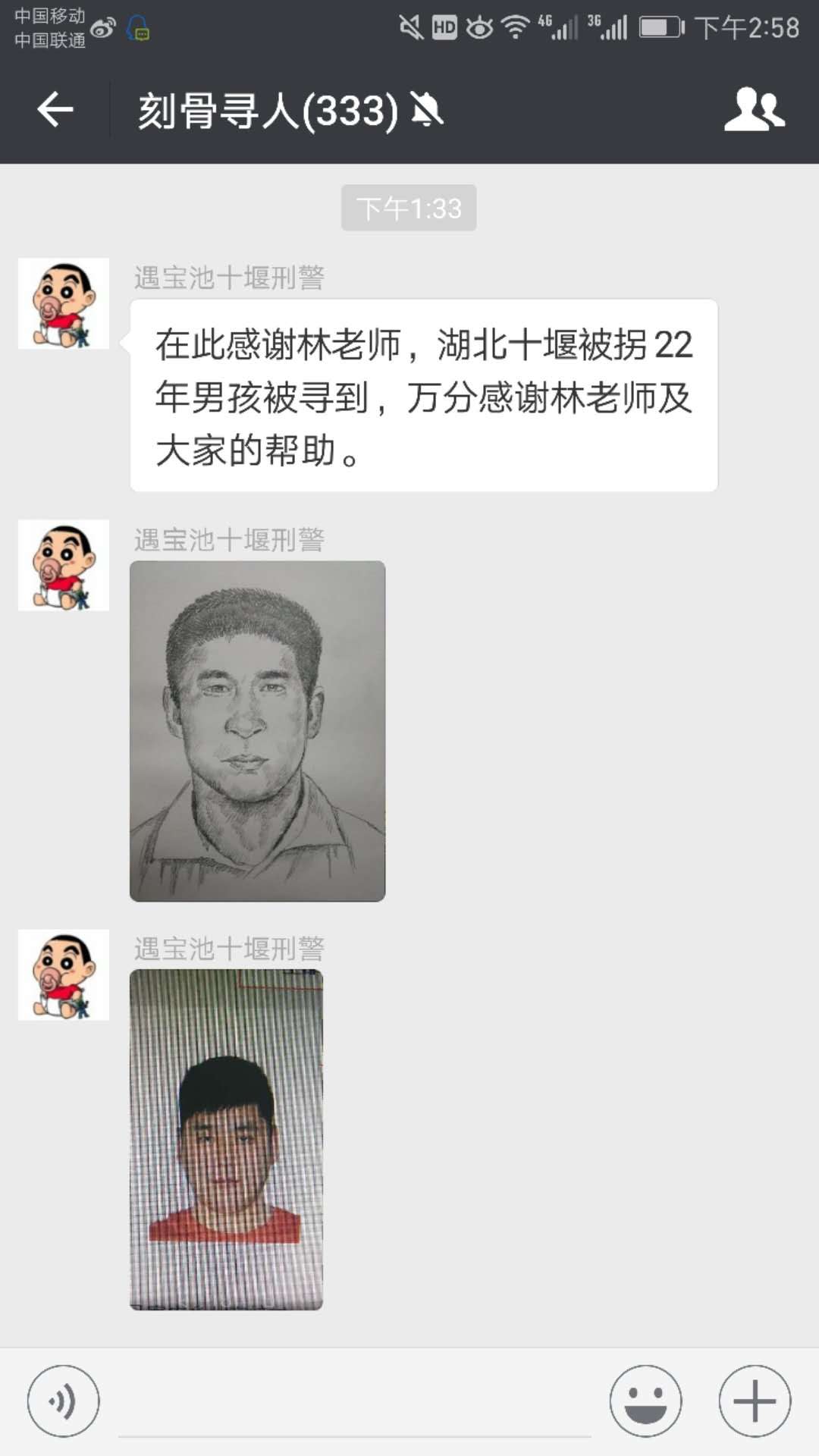 林宇輝用當時僅存的兩張鵬鵬3歲時的照片,模擬畫出22年以后鵬鵬的畫像。隨后民警再拿著這些畫像進行比對。拿著這些畫像,民警又趕到河北邯鄲當地的村莊遍貼懸賞通告,懸賞金由3萬元提升到5萬元。
