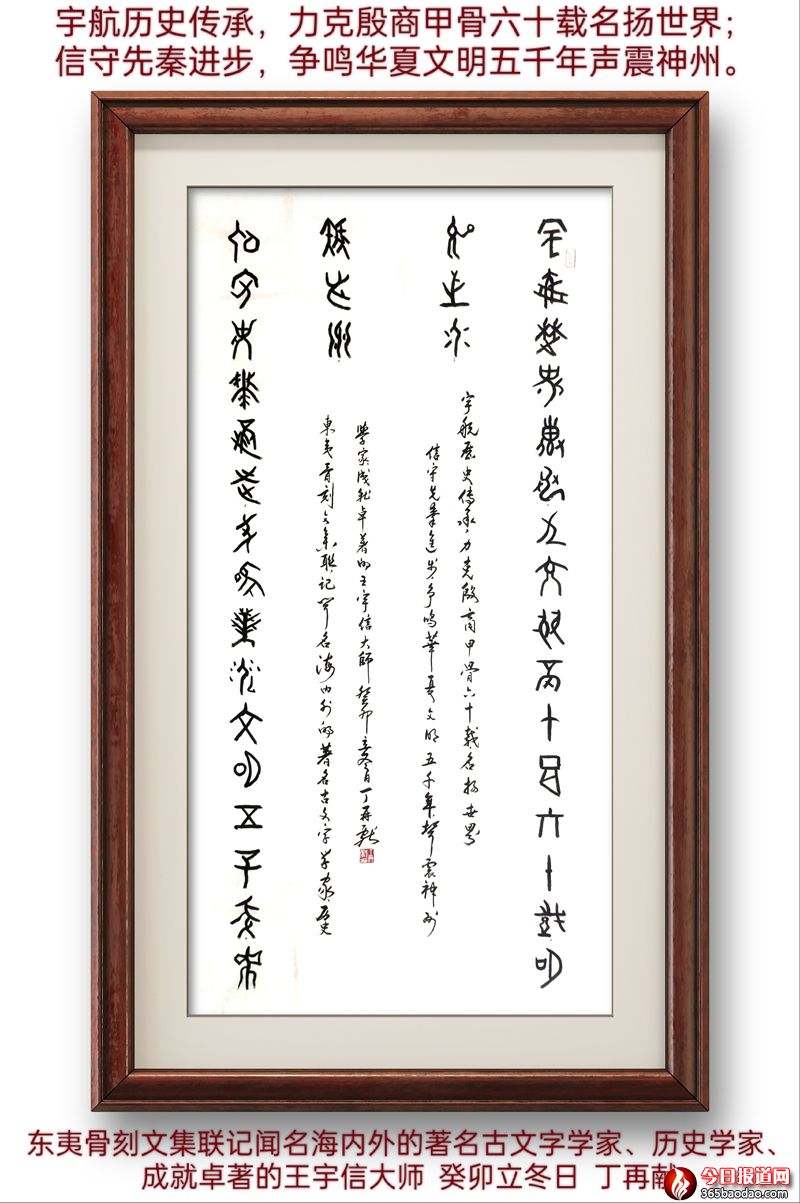 這是一副藏頭對聯(lián),丁先生將王老“宇信”二字巧妙的嵌在上下聯(lián)的首字,該聯(lián)上下各19言,共38個字,將王宇信先生一生拼搏和奉獻(xiàn)基本概括其中,隨后丁先生用始創(chuàng)的骨刻文書法藝術(shù)書寫而成,可謂佳聯(lián)佳作了。